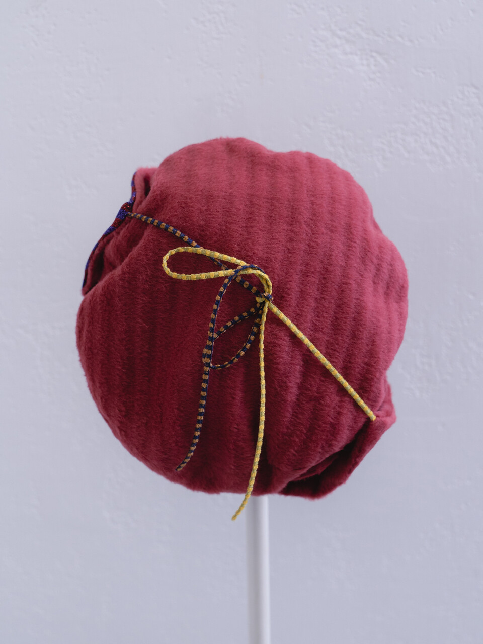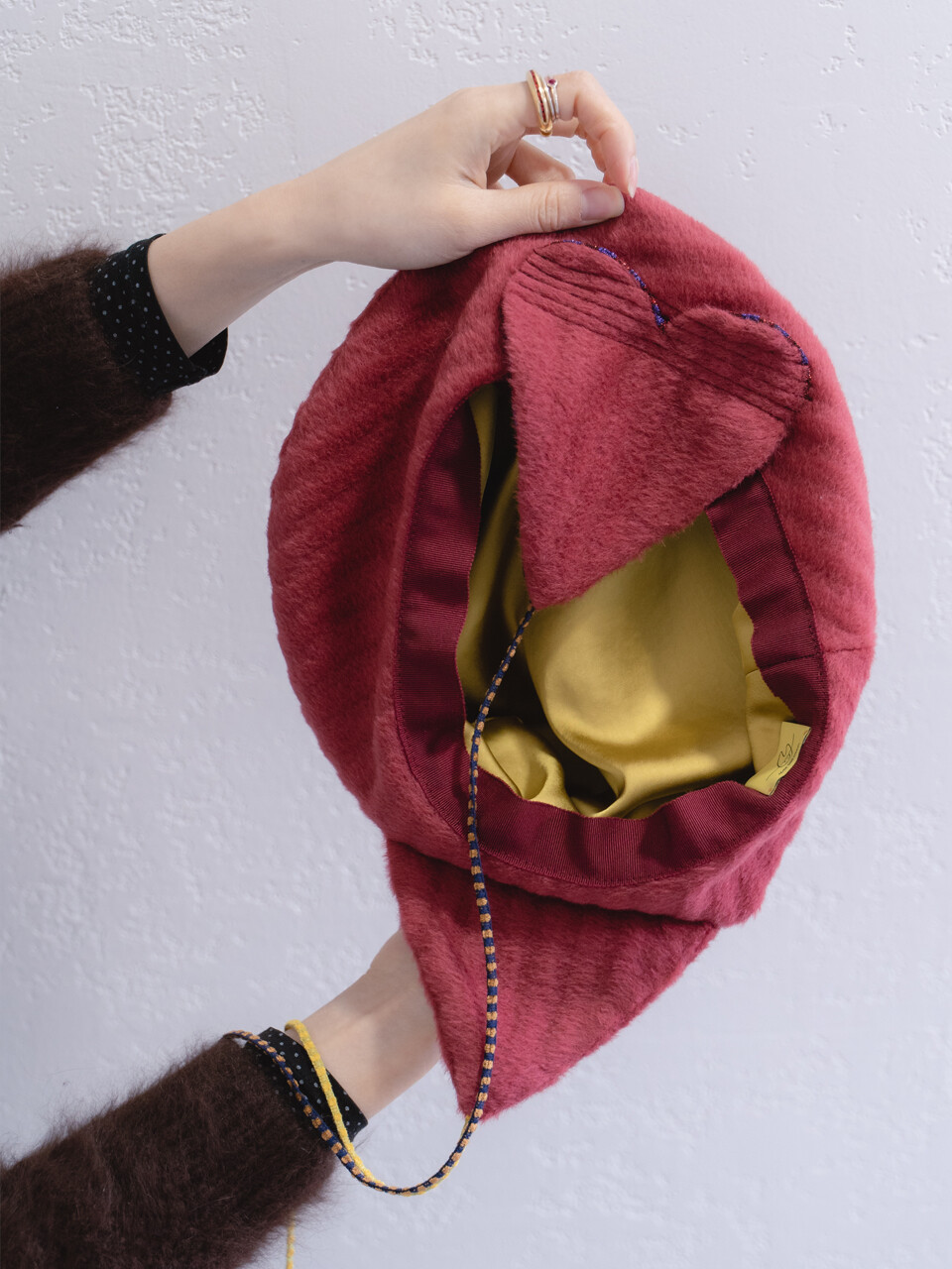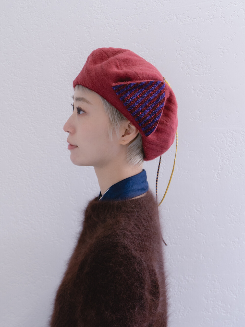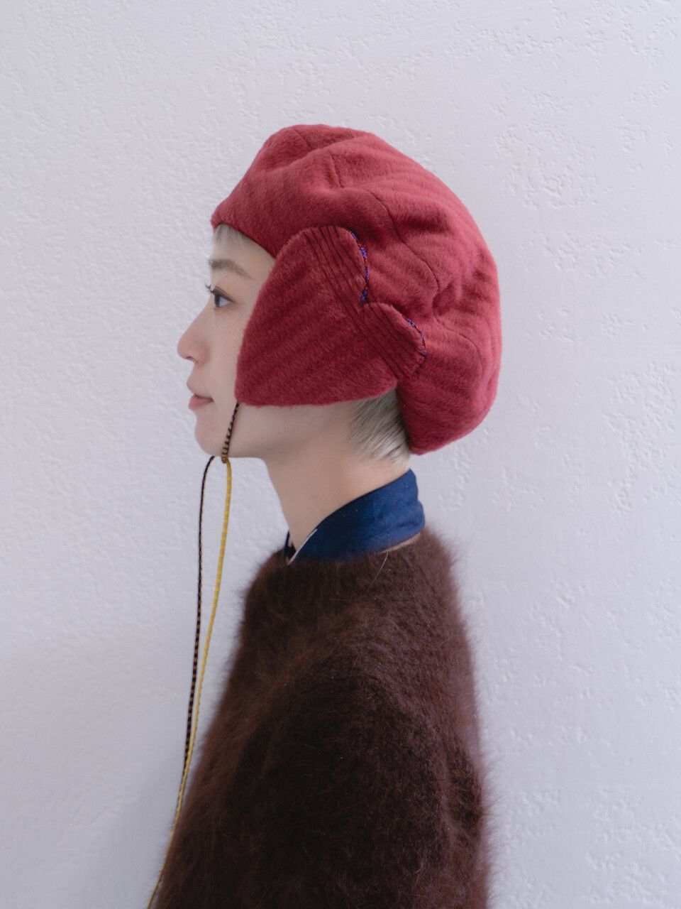 와인 핑크 컬러의 스트라이프 울 소재 , 이어플랩 한 쪽 반짝이는 메시 원단과 안감 컬러의 조화가 무척 사랑스러운 베레입니다.