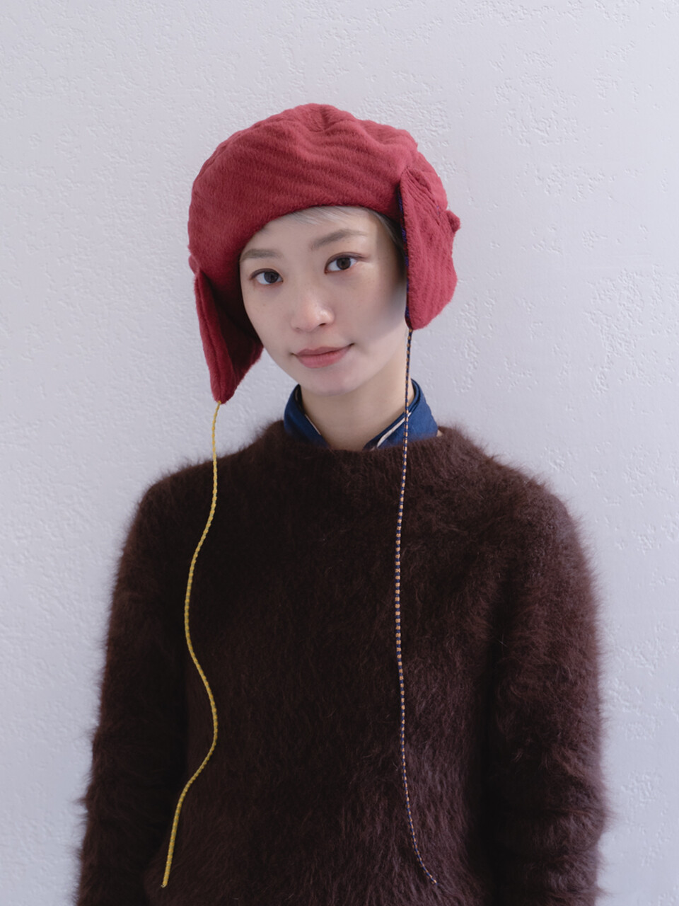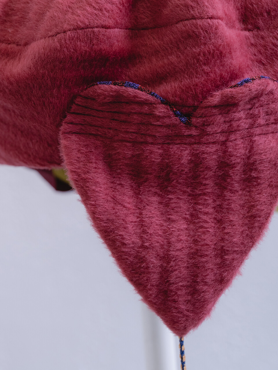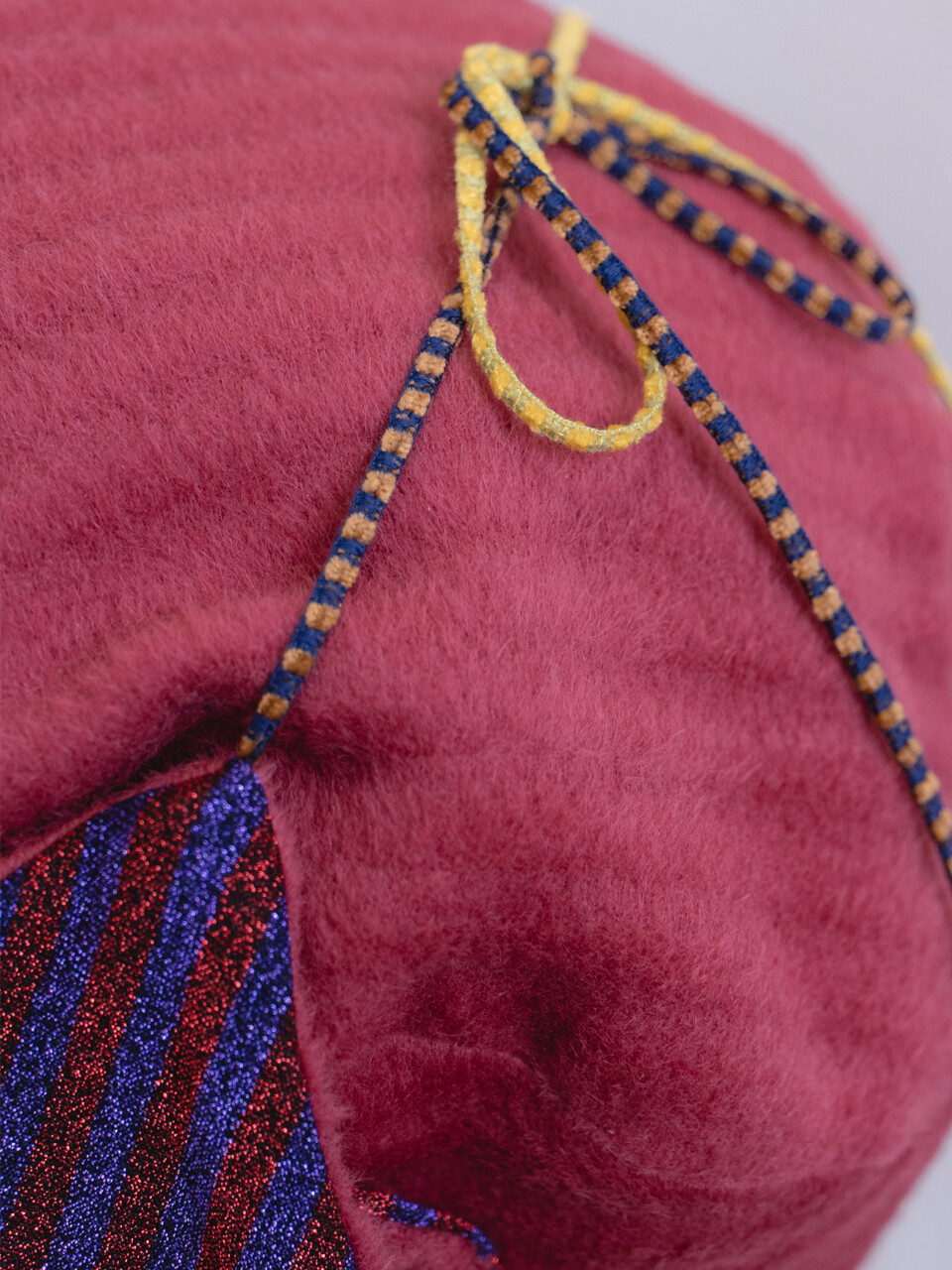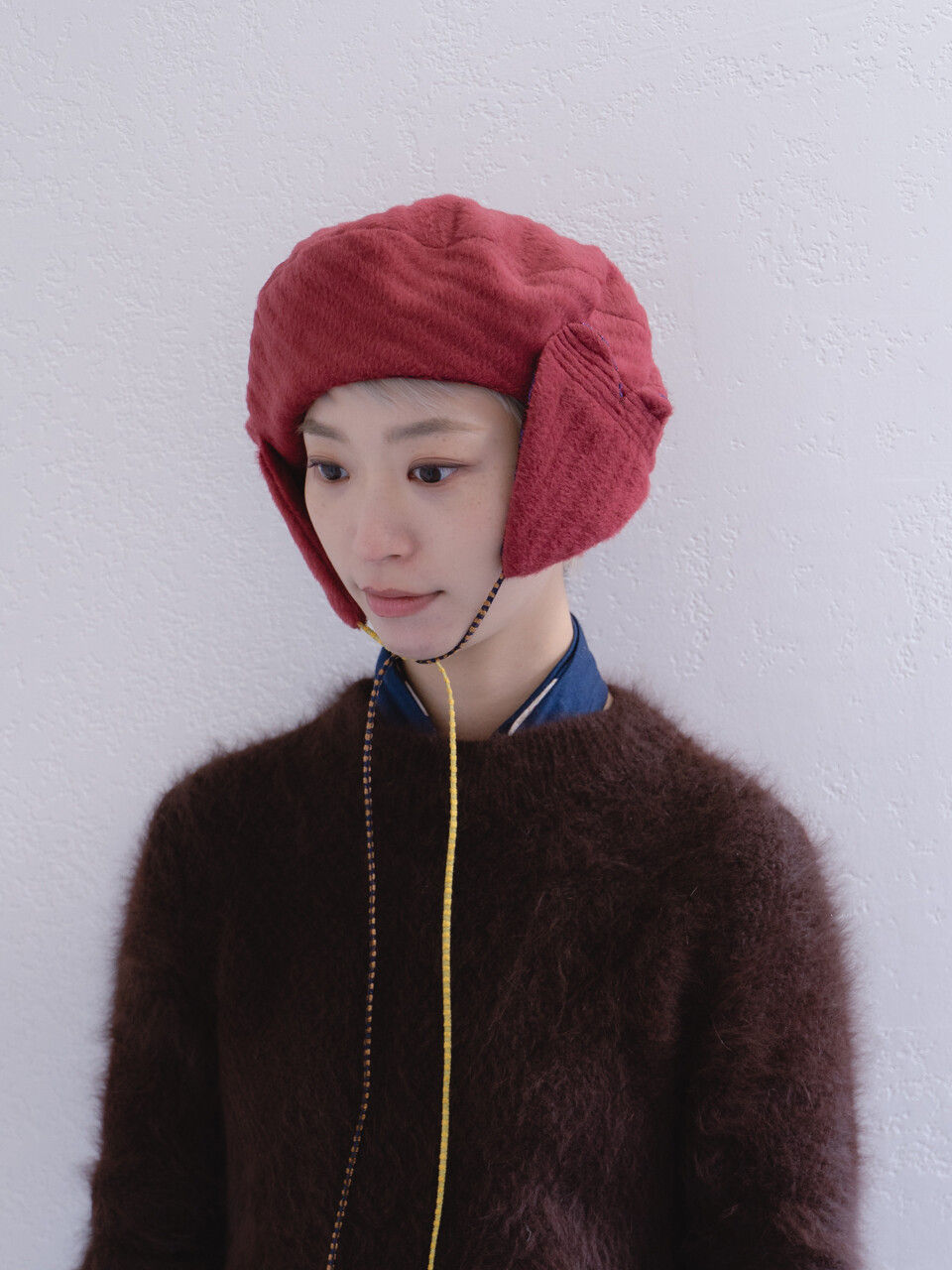 와인 핑크 컬러의 스트라이프 울 소재 , 이어플랩 한 쪽 반짝이는 메시 원단과 안감 컬러의 조화가 무척 사랑스러운 베레입니다.
