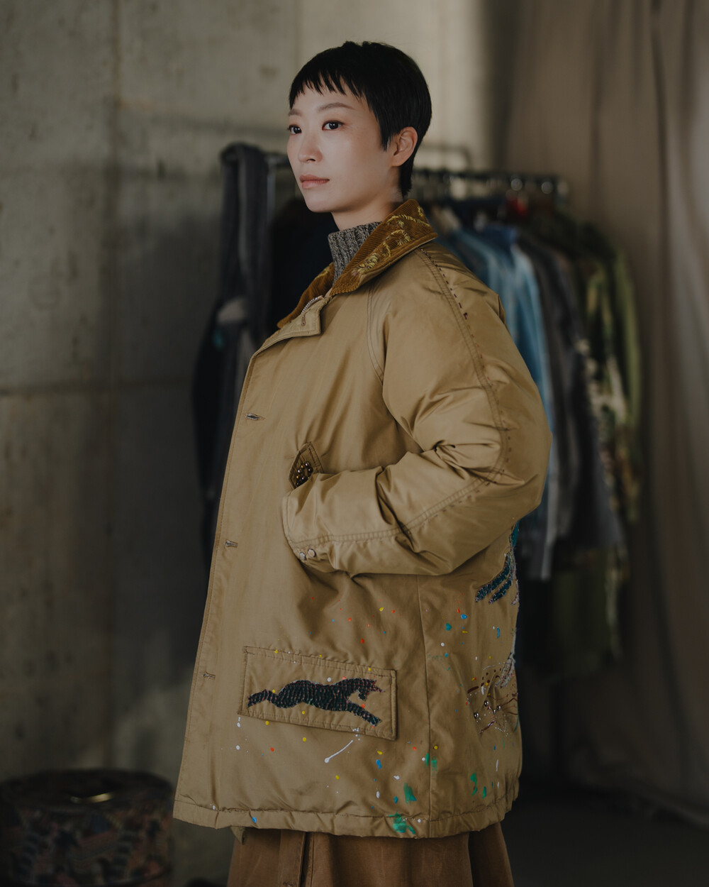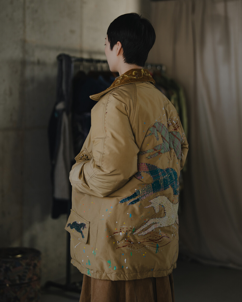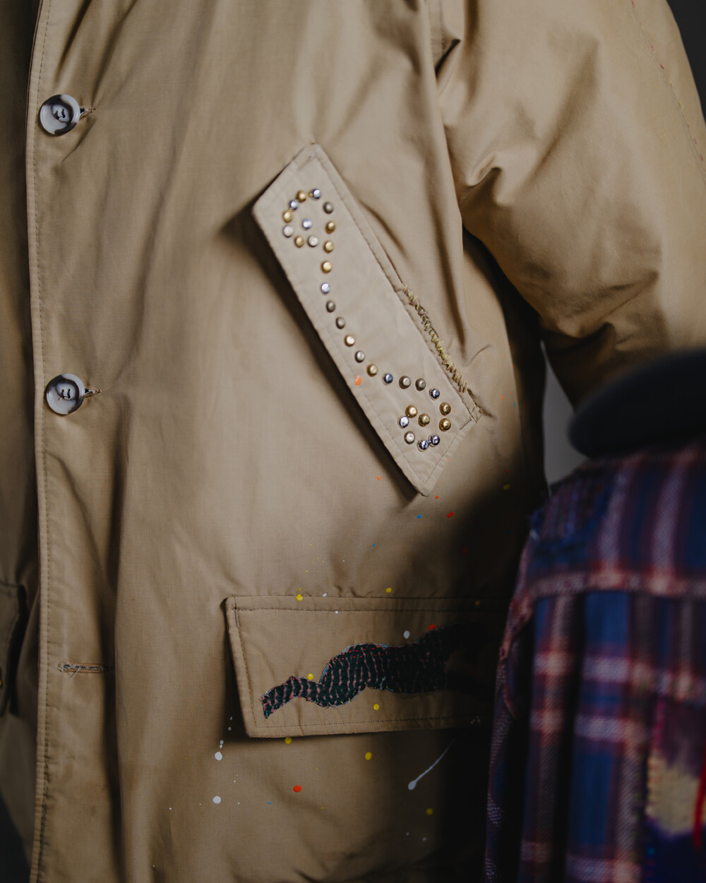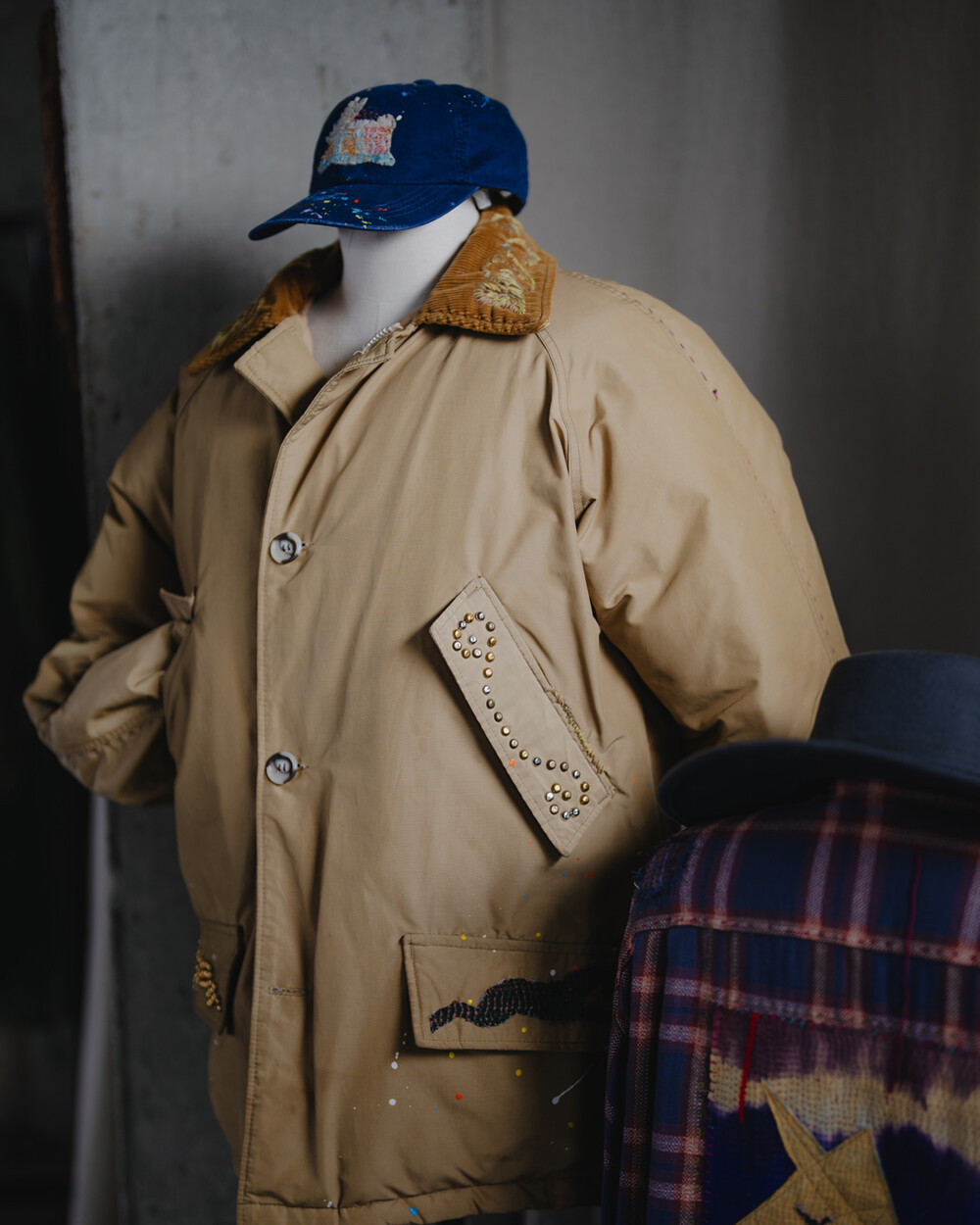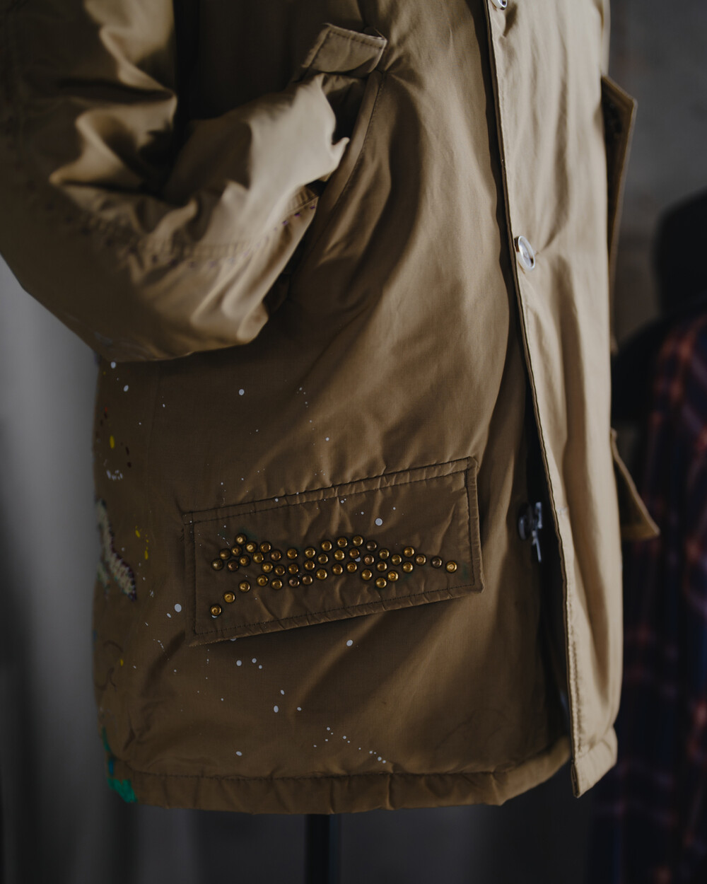 포켓 디테일의 스터드 장식과 곳곳의 페인팅 커스텀으로