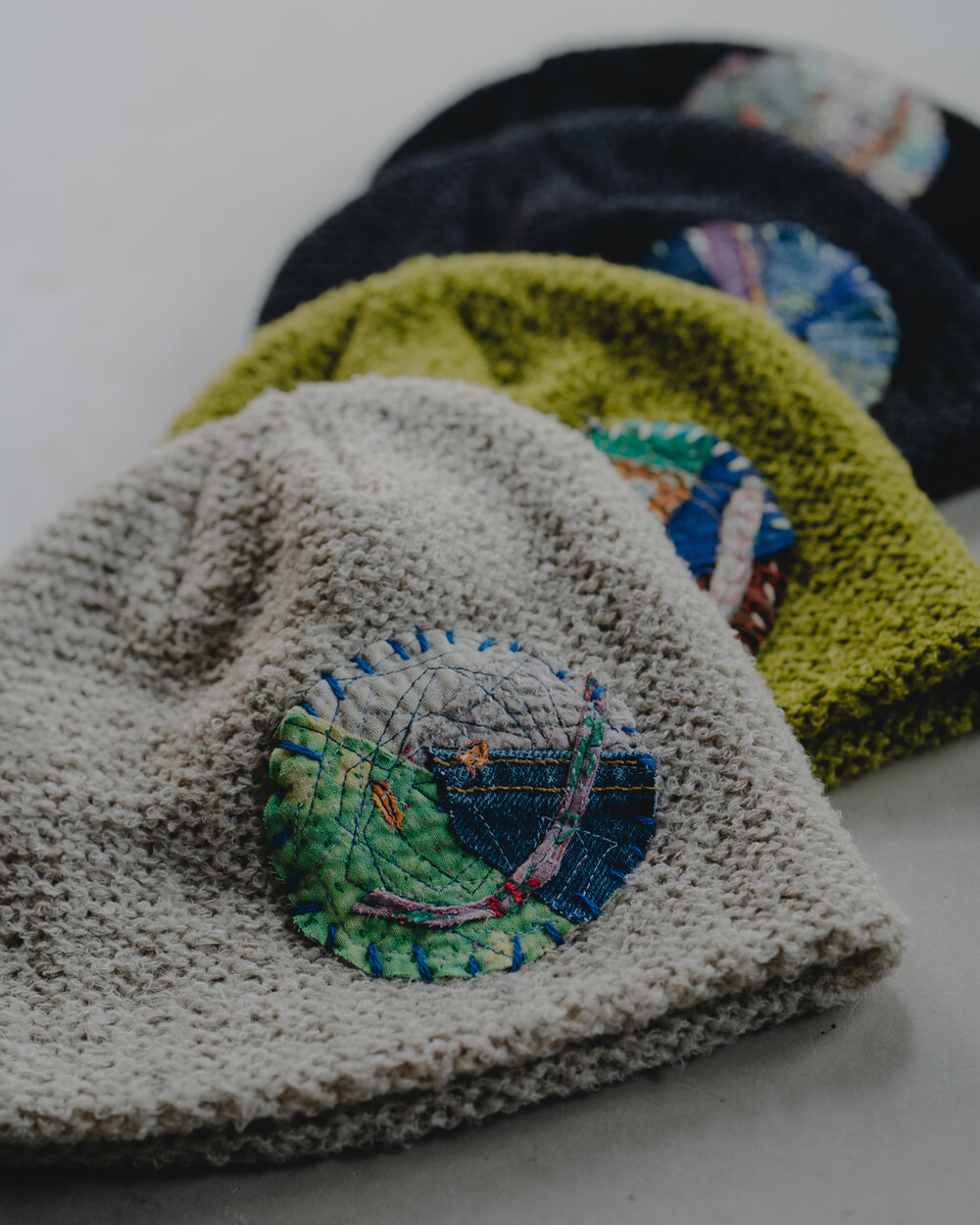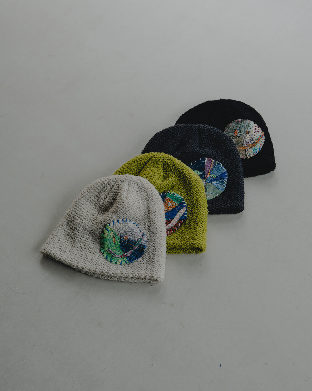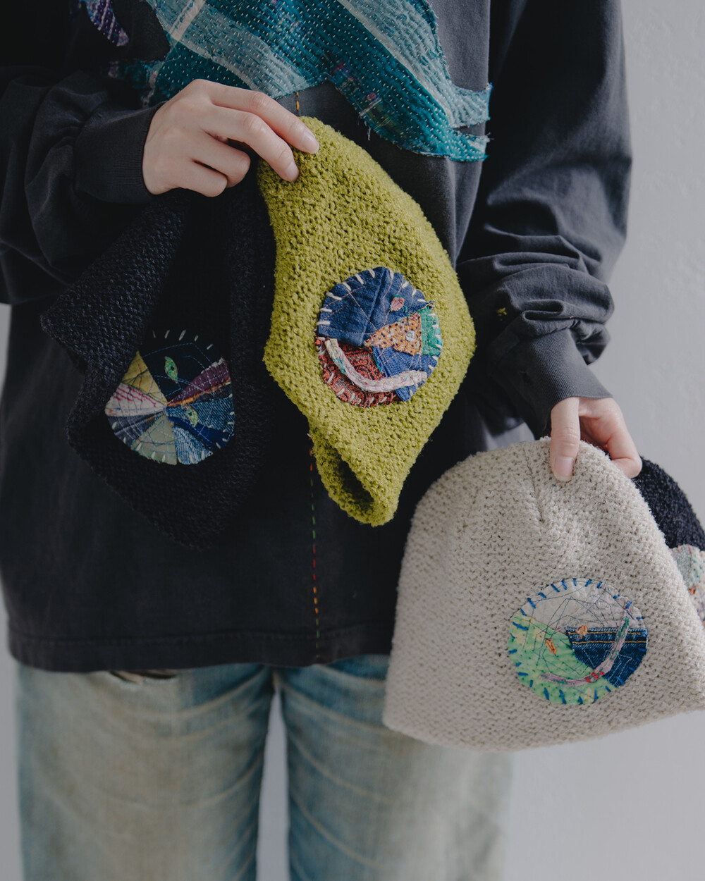 포근한 니트 비니에 원형 패치워크 자수가 더해져 각각 다른 색감과 디테일로 유니크한 매력을 보여줍니다.