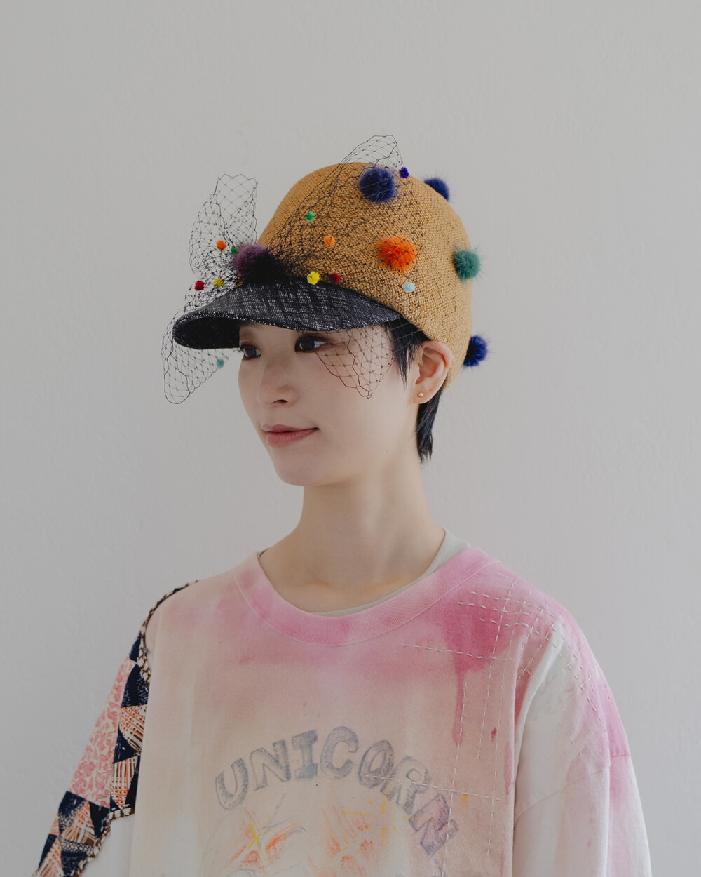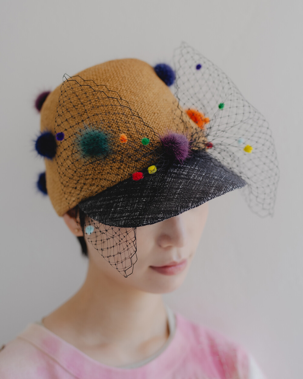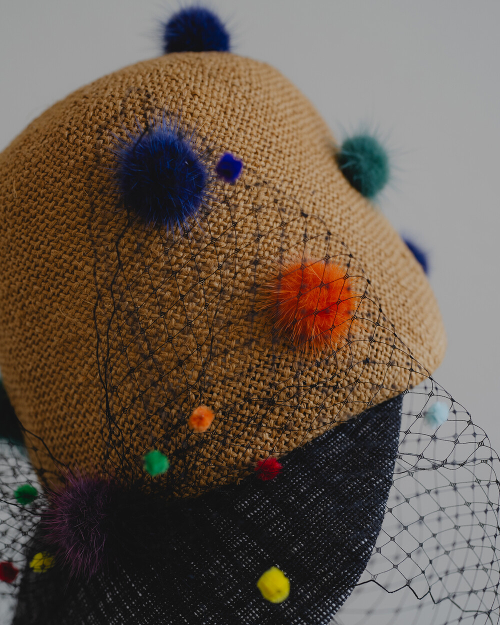 독특한 밀짚 소재에 밍크 털 폼폼과 망사 디테일로 마무리해 고급스러운 분위기를 더한 캡 모자입니다.