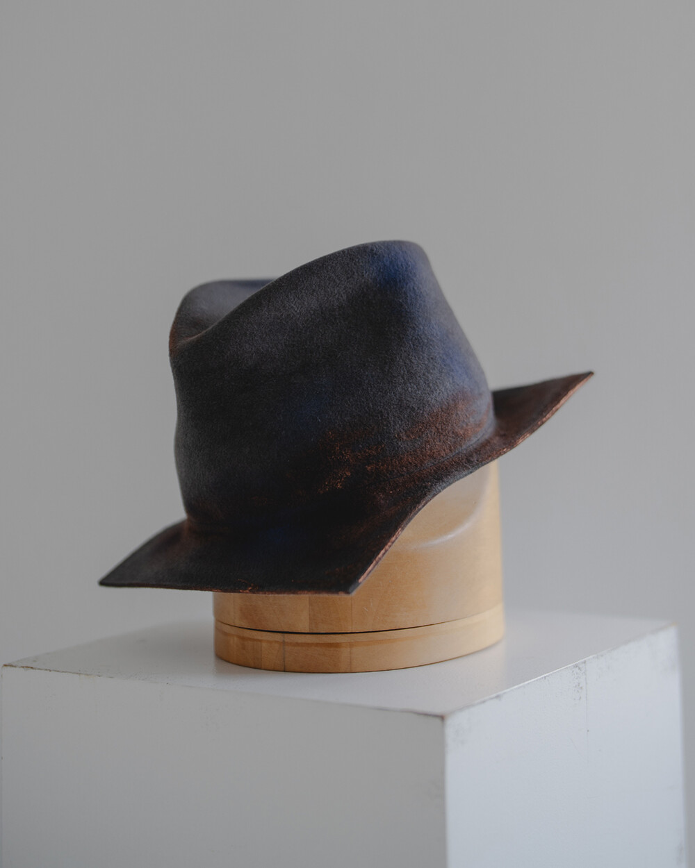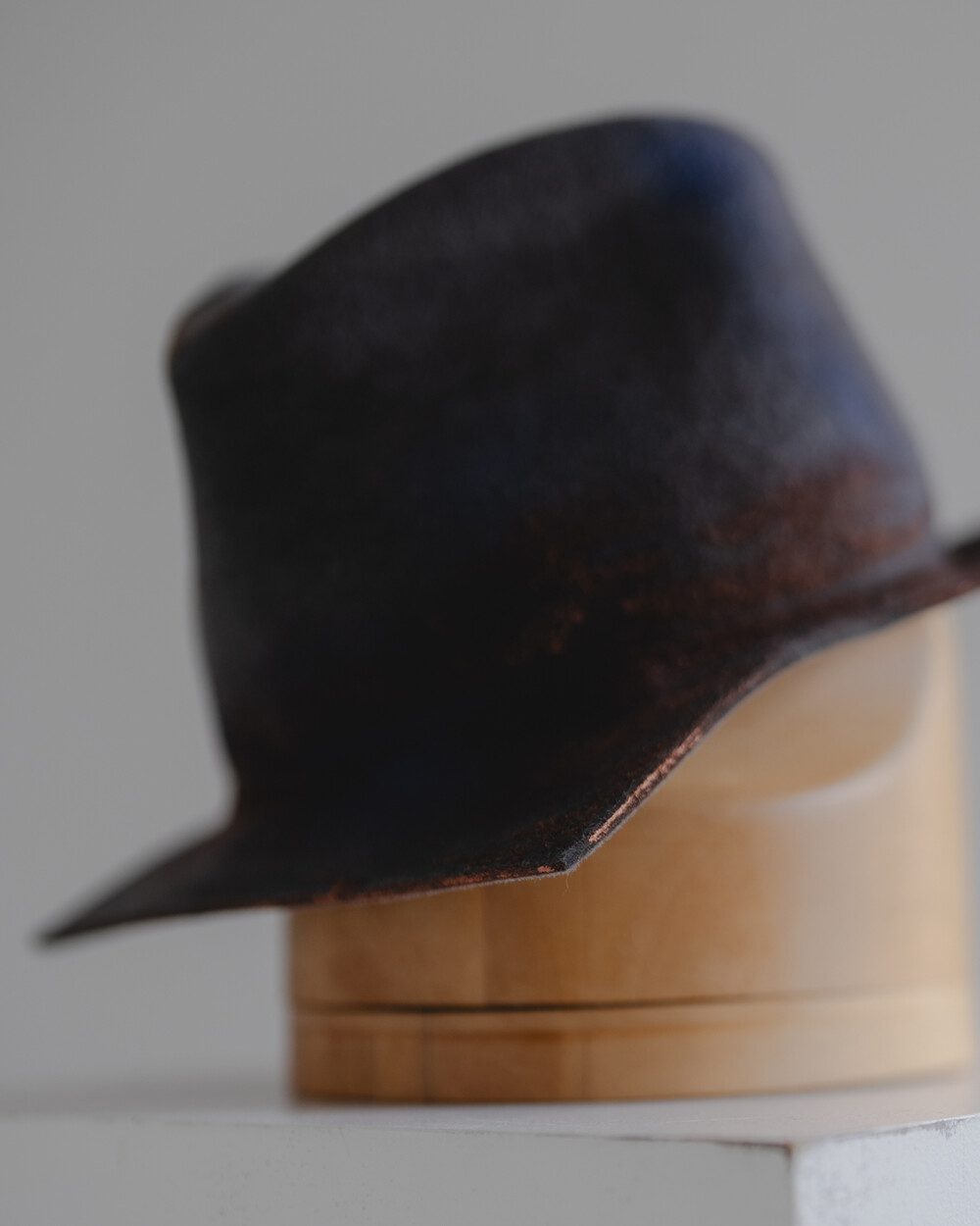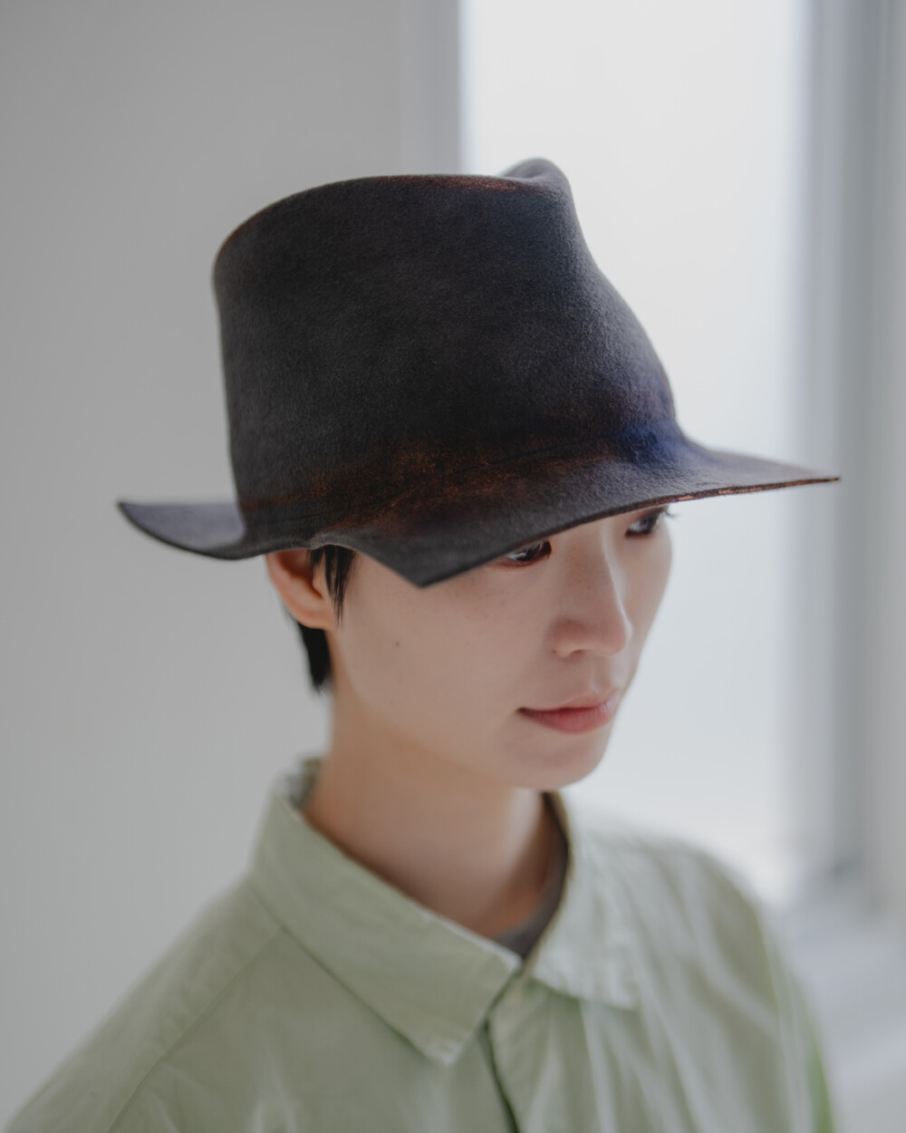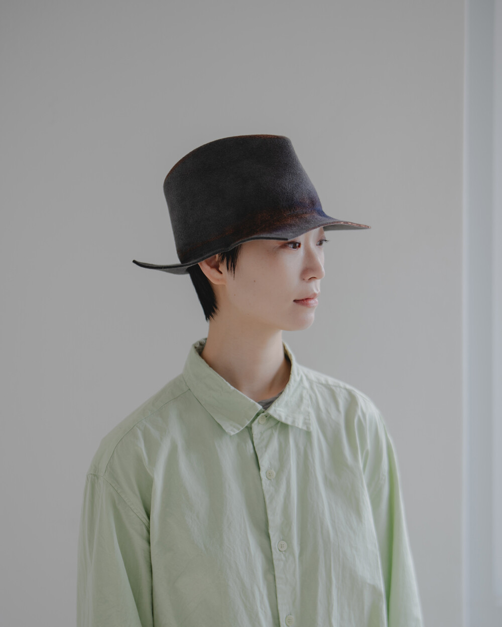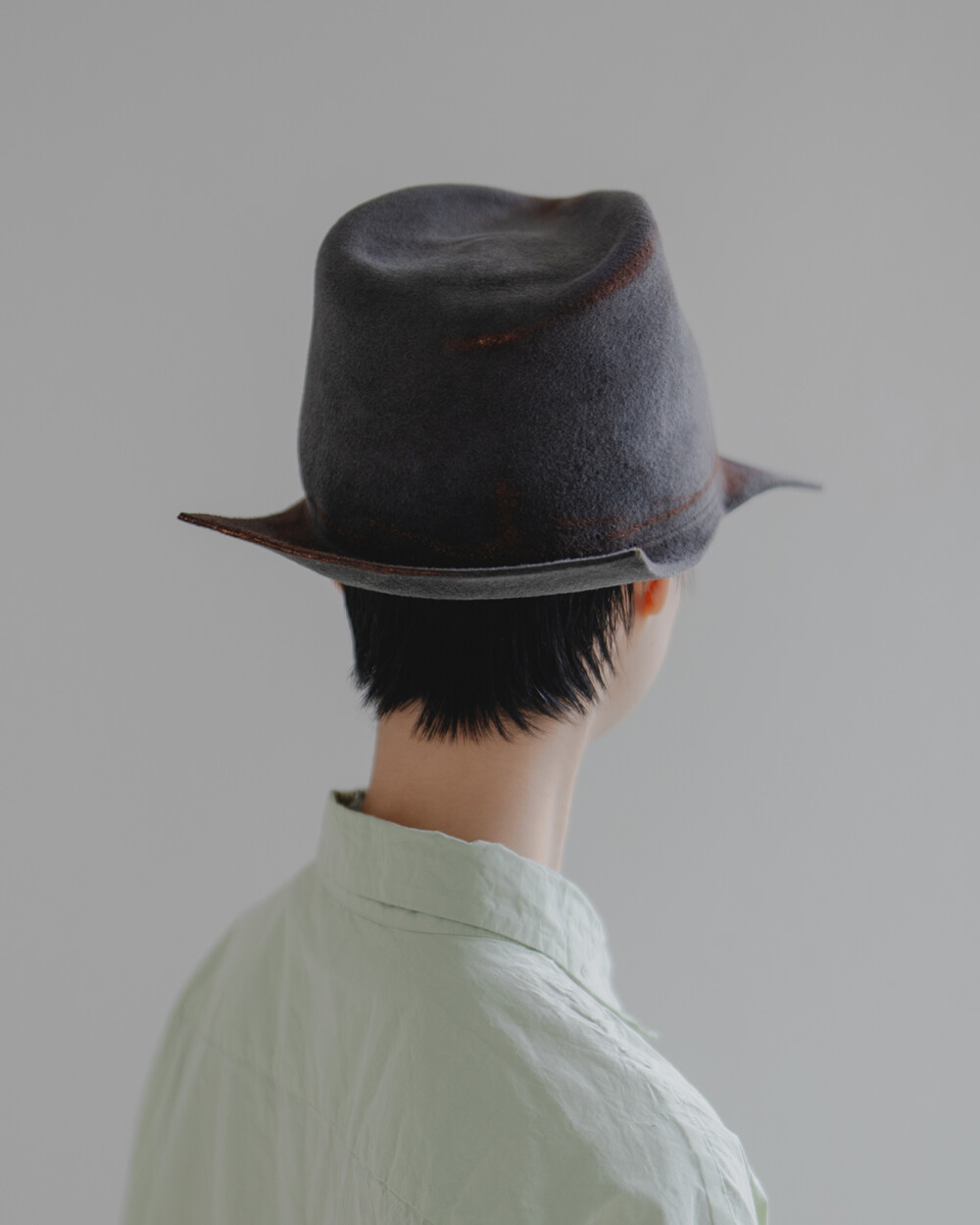 손끝으로 느껴지는 부드러운 래빗퍼 펠트의 질감, 그리고 그 위에 얹힌 오묘한 그레이 색감이 시선을 사로잡습니다. 정형화된 형태를 벗어난 스퀘어 브림은 썼을 때 자연스럽게 멋스러운 실루엣을 만들어냅니다. 60cm의 여유 있고 깊은 핏으로 제작되어 푹 눌러썼을 때의 안정감과 분위기가 특히 좋습니다.