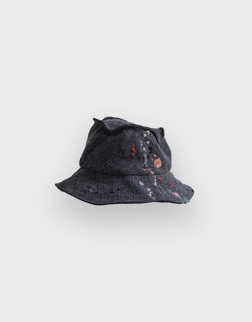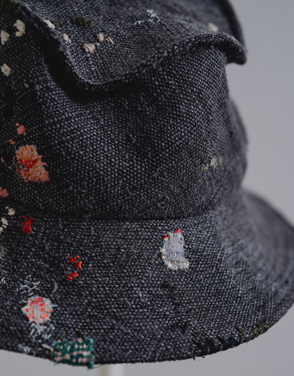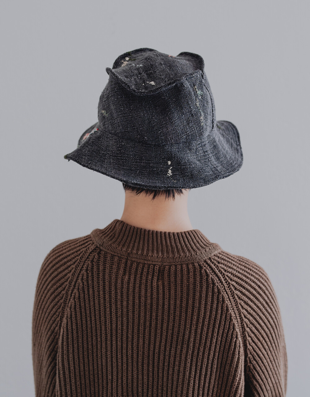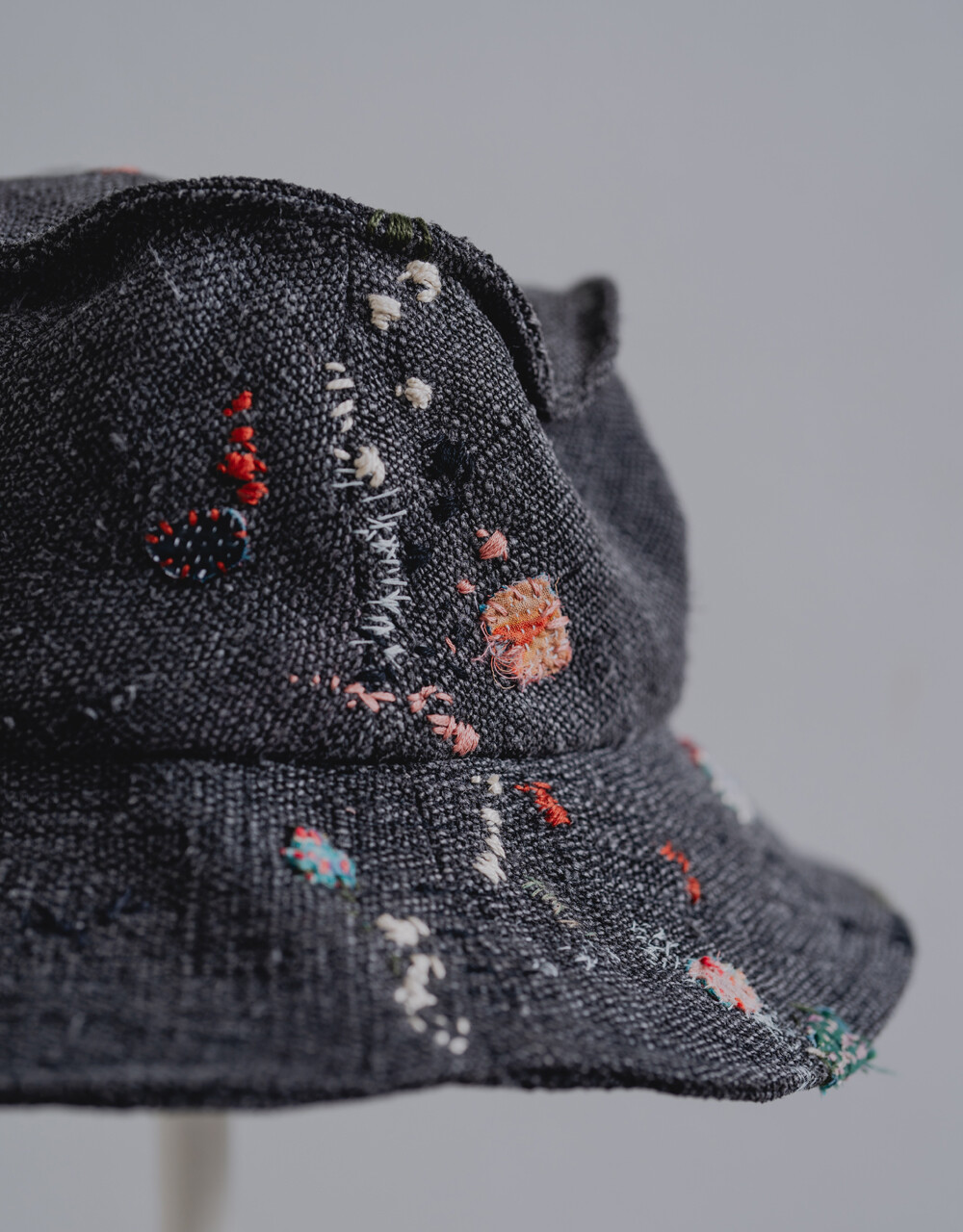 모자를 만들어 인도의 빈티지 보로 원단과 손자수를 더하였습니다.