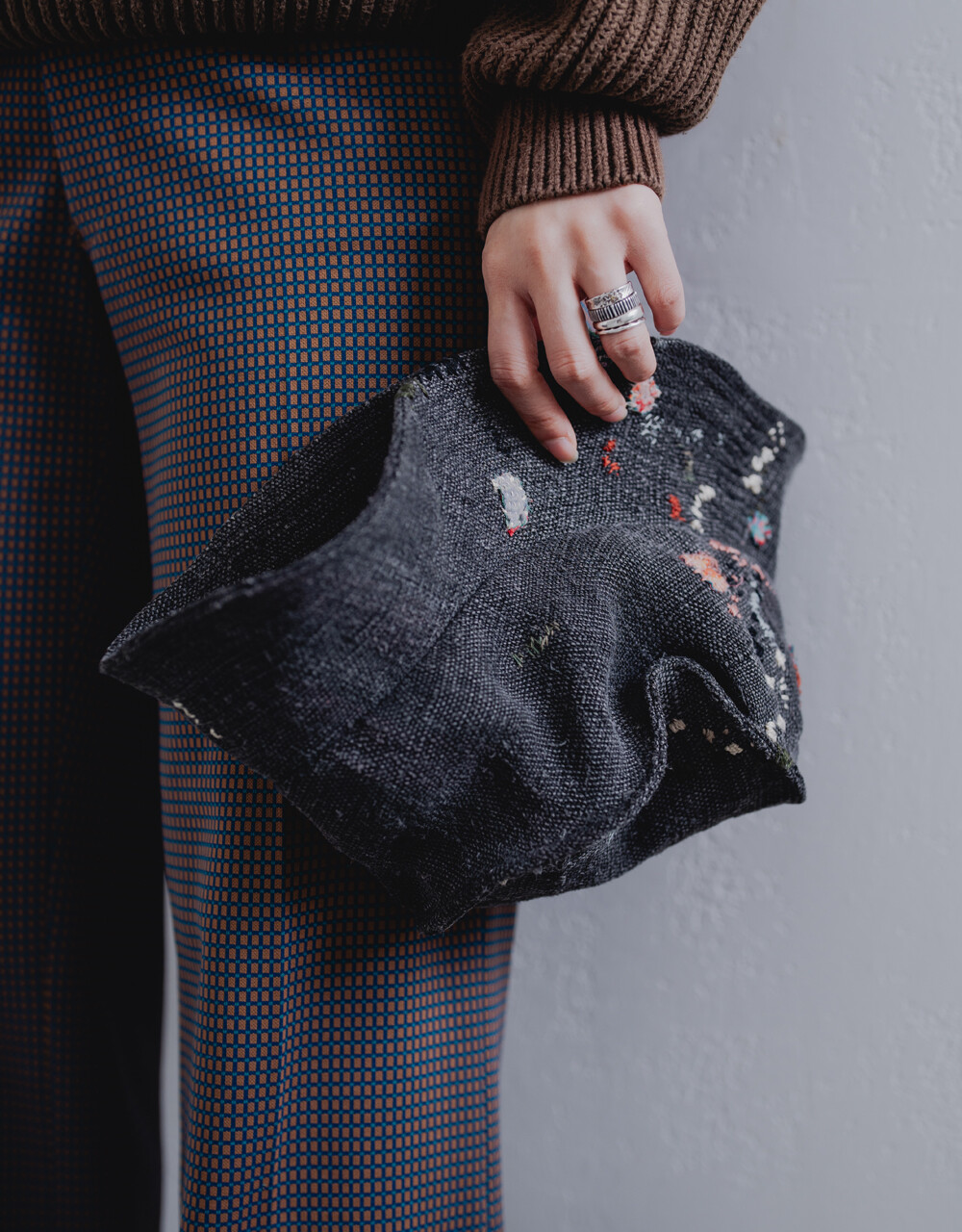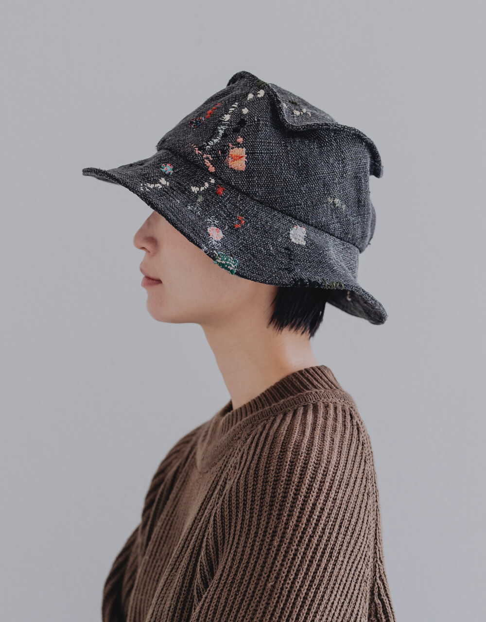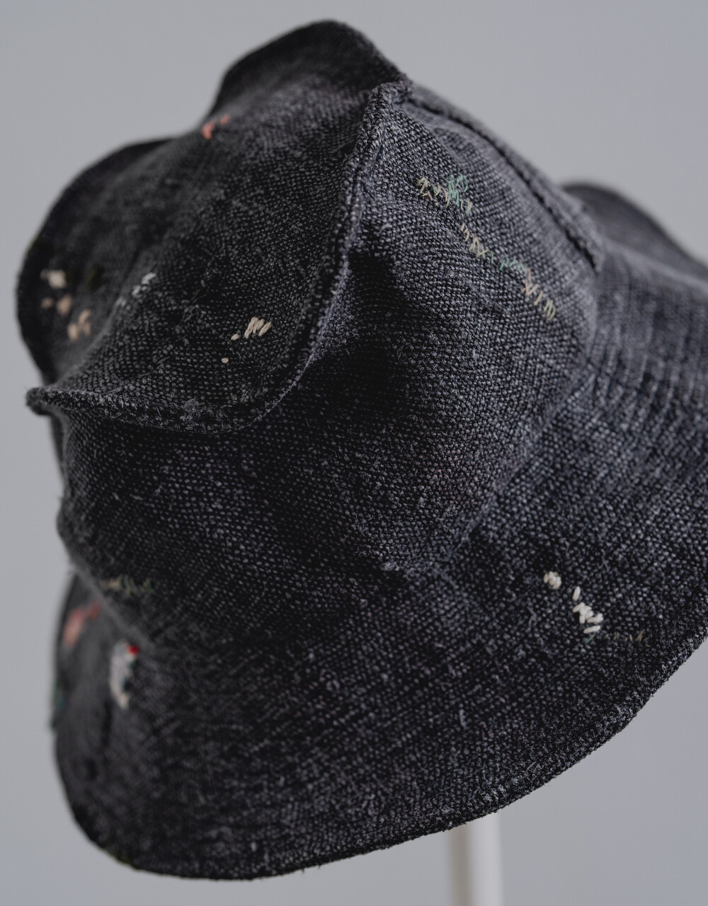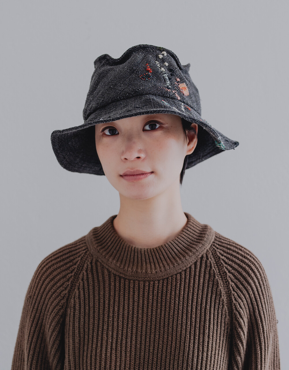 모자를 만들어 인도의 빈티지 보로 원단과 손자수를 더하였습니다.