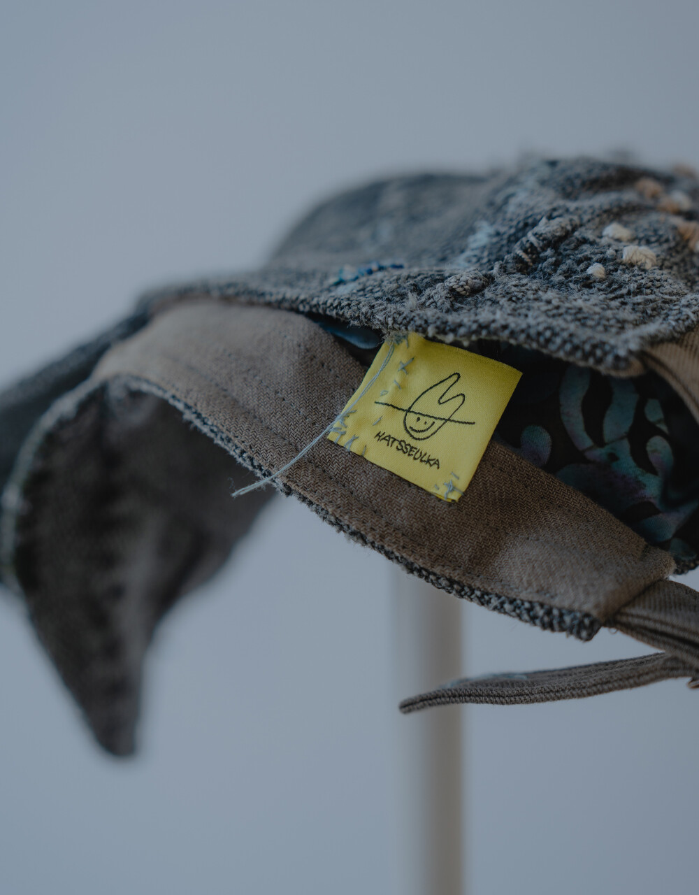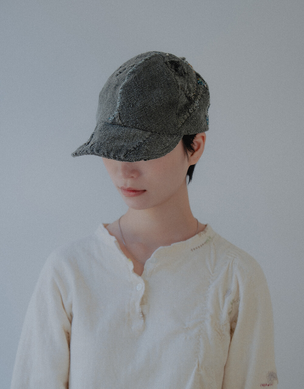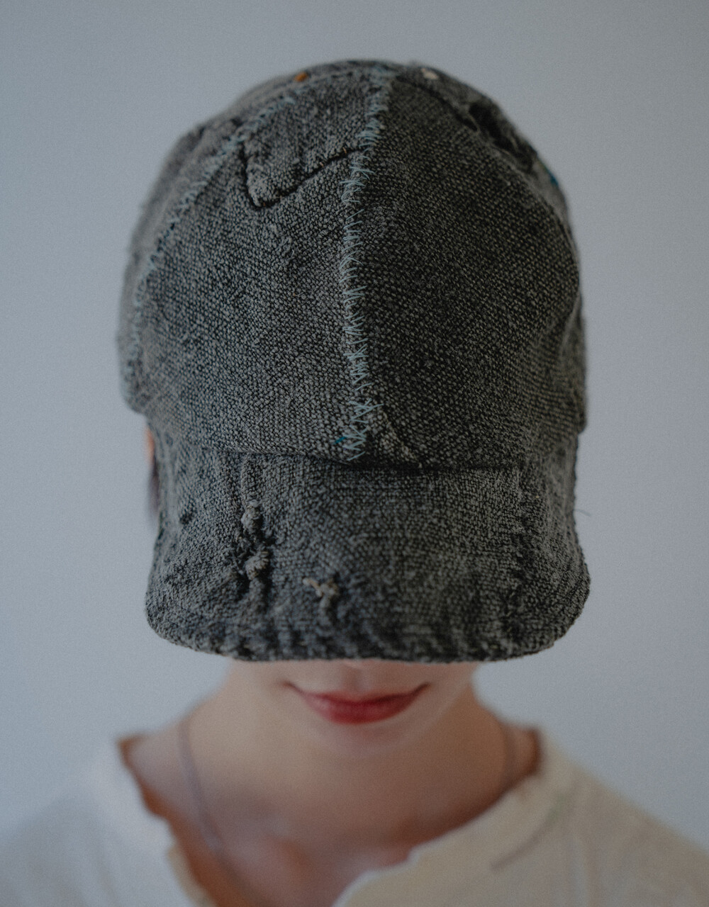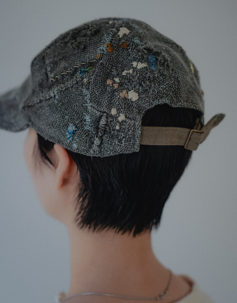 모자를 만들어 인도의 빈티지 보로 원단과 손자수를 더하였습니다.