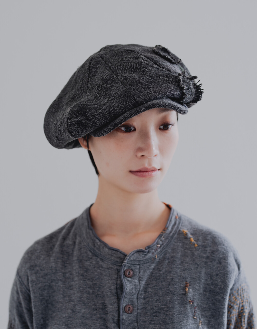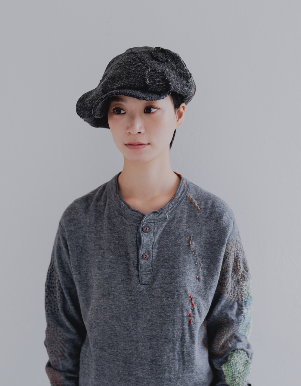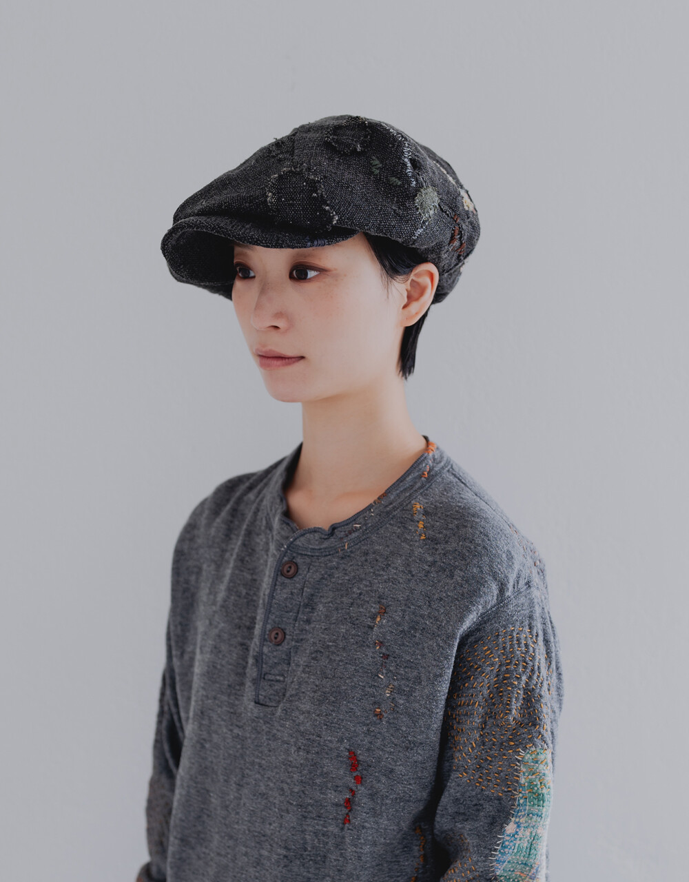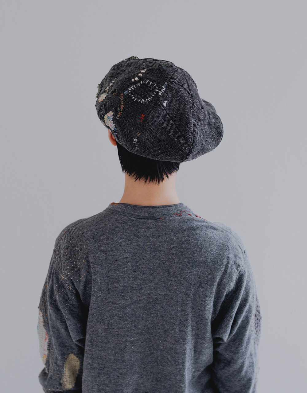 모자를 만들어 인도의 빈티지 보로 원단과 손자수를 더하였습니다.