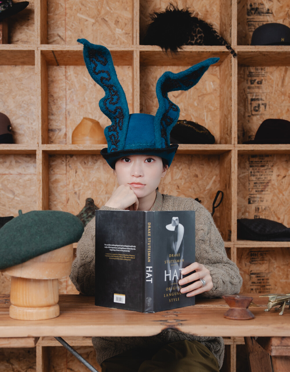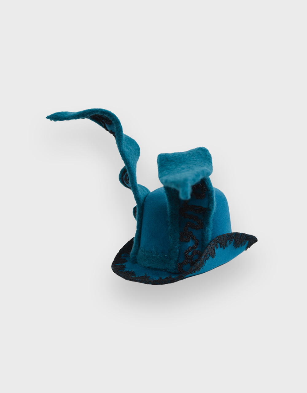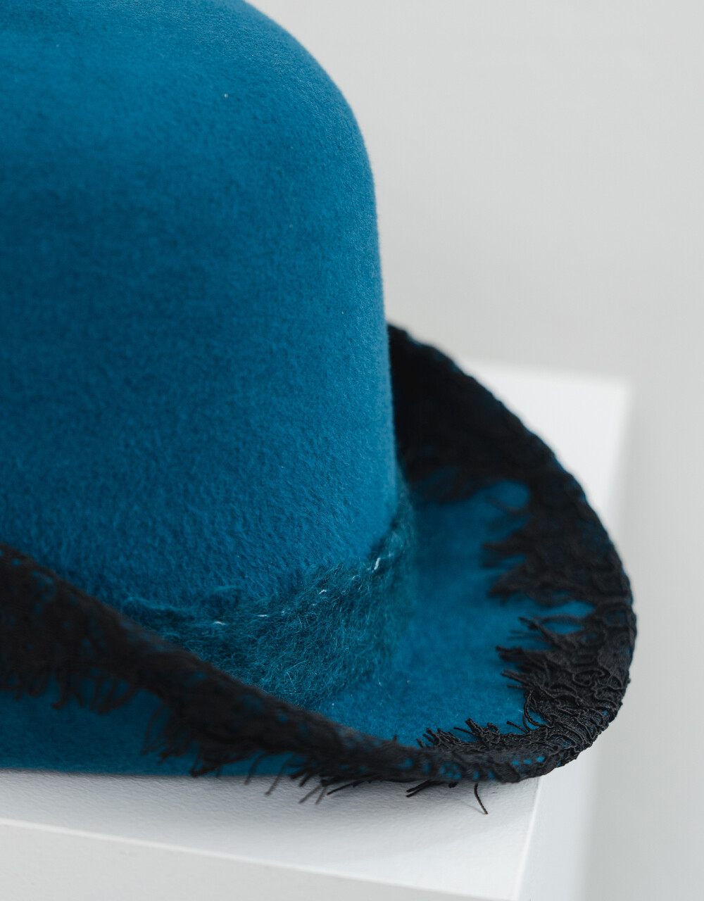*부드러운 스웨이드 래빗 퍼 소재의 페도라 *같은 컬러의 알파카 울 원단으로 또 다른 원단의 재미를 보여줍니다. *토끼 귀 부분에 와이어는 모양을 변형 할 수 있습니다. 힘 있고 탄탄한 밀리너리(햇 메이커) 전용 와이어를 사용합니다. *터키블루 컬러와 블랙/네이비 컬러의 조화