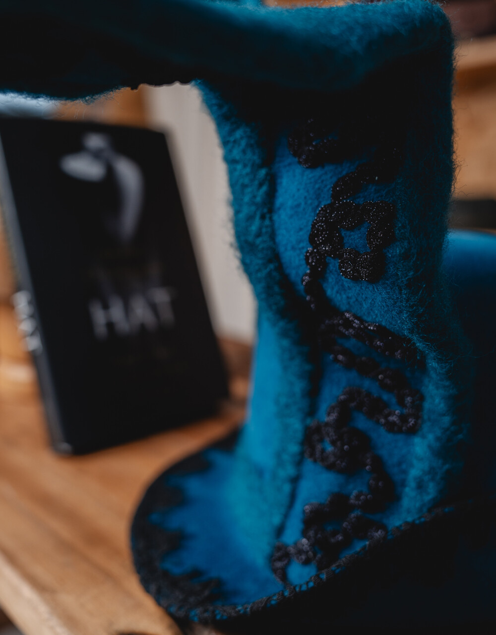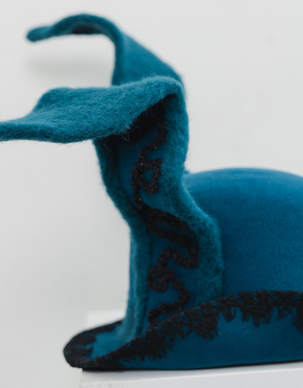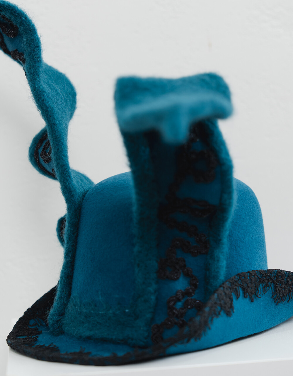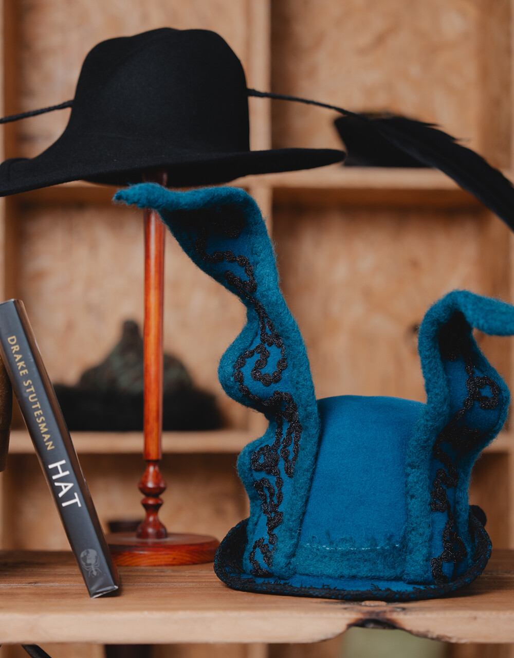 *부드러운 스웨이드 래빗 퍼 소재의 페도라 *같은 컬러의 알파카 울 원단으로 또 다른 원단의 재미를 보여줍니다. *토끼 귀 부분에 와이어는 모양을 변형 할 수 있습니다. 힘 있고 탄탄한 밀리너리(햇 메이커) 전용 와이어를 사용합니다. *터키블루 컬러와 블랙/네이비 컬러의 조화